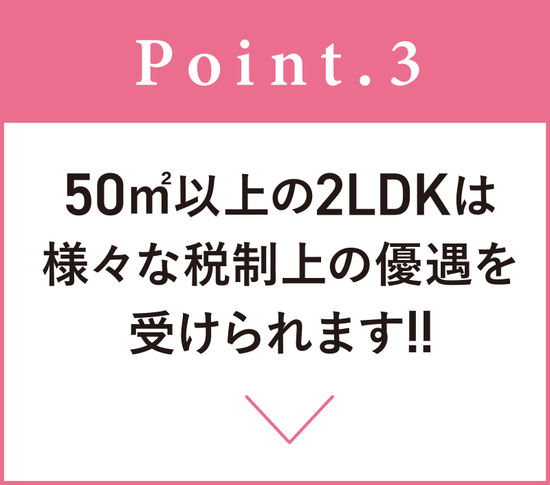 購入費用の安さという大きなメリットから「2LDK」「コンパクト」を選ぶ際、ポイントとなるのが「床面積が50㎡以上」あるかどうかということです。この条件をクリアした住戸を購入する場合であれば、様々な税制上の優遇を受けることができる場合があります。