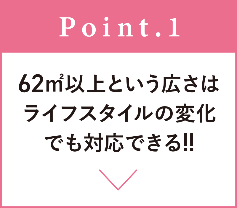 「グランドキャッスル戸畑STA.」の2LDK住戸は、62㎡以上の広さを確保。今はもちろん将来の快適性を見据え、1人で暮らし始めた際は洋室1室を趣味の部屋にしたり、結婚して2人暮らしを始めたらそれぞれの個室として活用したり。様々なライフスタイルに合わせて使いこなせます。