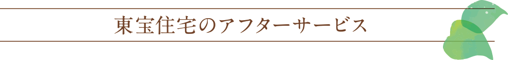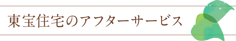 「いつまでも快適なマンションライフをお過ごし頂く為に・・・。」東宝住宅では「アフターサービス規準」に基づいた迅速なケア・アフターサービスを実行しています。東宝住宅とお客様とのお付き合いは、お引渡しが完了したら終わりではありません。 ご入居した時から、また新たなお付き合いが始まります。それは、アフターサービスを売主の責任として直接実施しているからです。「マンションを厳しく管理し、アフターケアもしっかり行う」それは売主としてのお客様に対する大切な役割と考えるからです。 ご契約時にお渡しする「アフターサービス規準」に基づき、お客様の大切な資産と快適な暮らしをお守り致します。 |