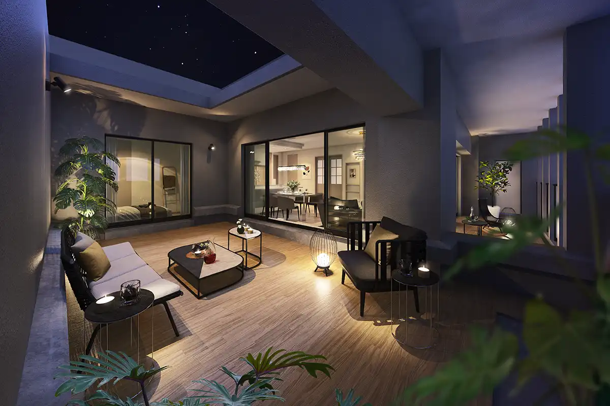 14F Htypeルーフバルコニー(CGパース)思うままに過ごす「洋室」や「主寝室」は、大切なプライベート空間として「個」の時間が育まれる仕様に。書斎はワークスペースとしての価値を大きく。オンラインや家族の時間にも目と気持ちが配れる設計になっています。14Fのルーフバルコニーは、家族のリフレッシュの場やゲストを迎える「おもてなし」のスペースとしても活用できます。