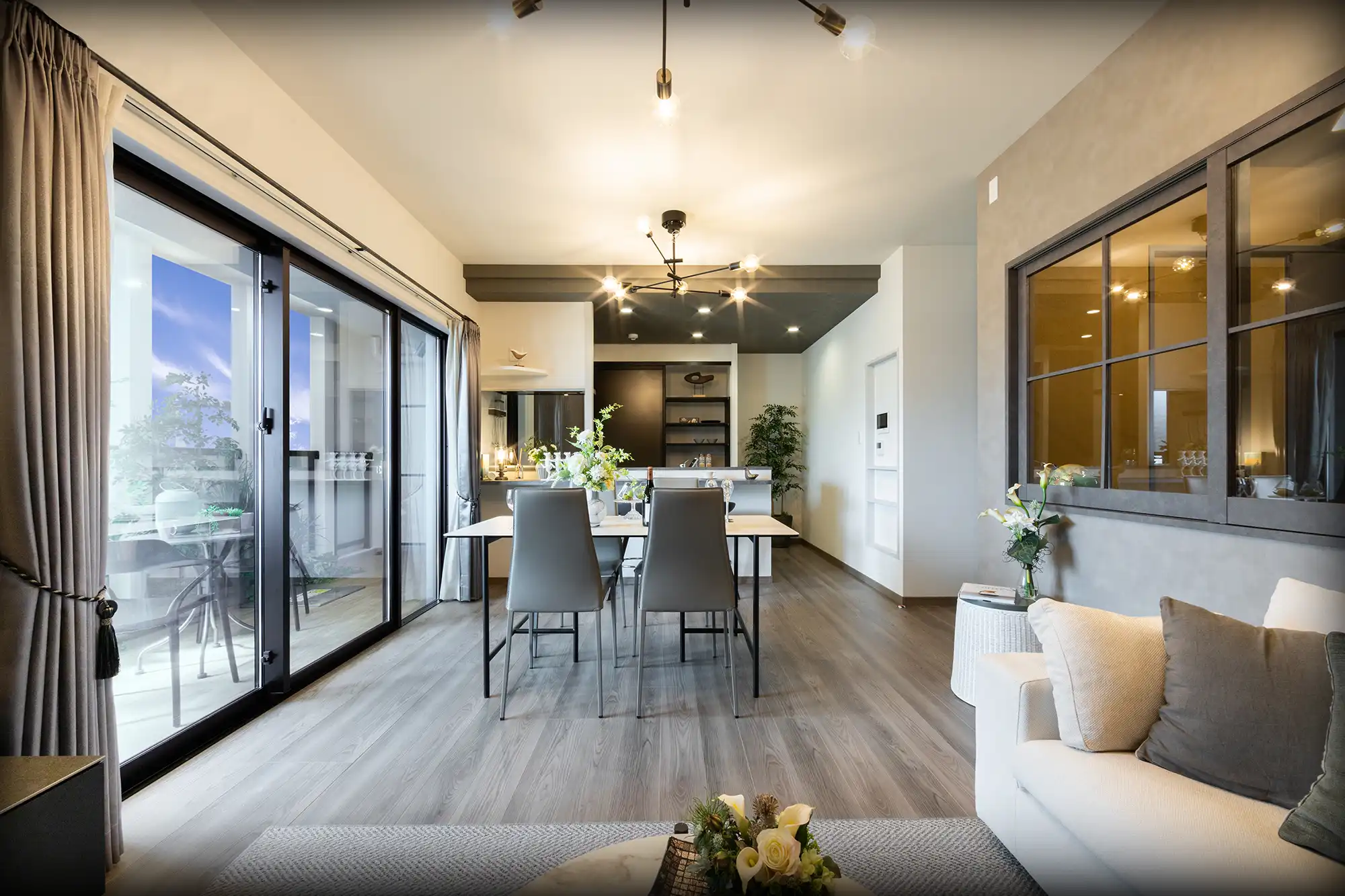*掲載の写真はモデルルーム(Eタイプオプション仕様)を撮影したものです(風景CG合成)。家具・照明・インテリア小物等については販売価格に含まれておりません。また、仕上げ、造作家具などオプション仕様になります。予めご了承下さい。(2023年4月撮影)